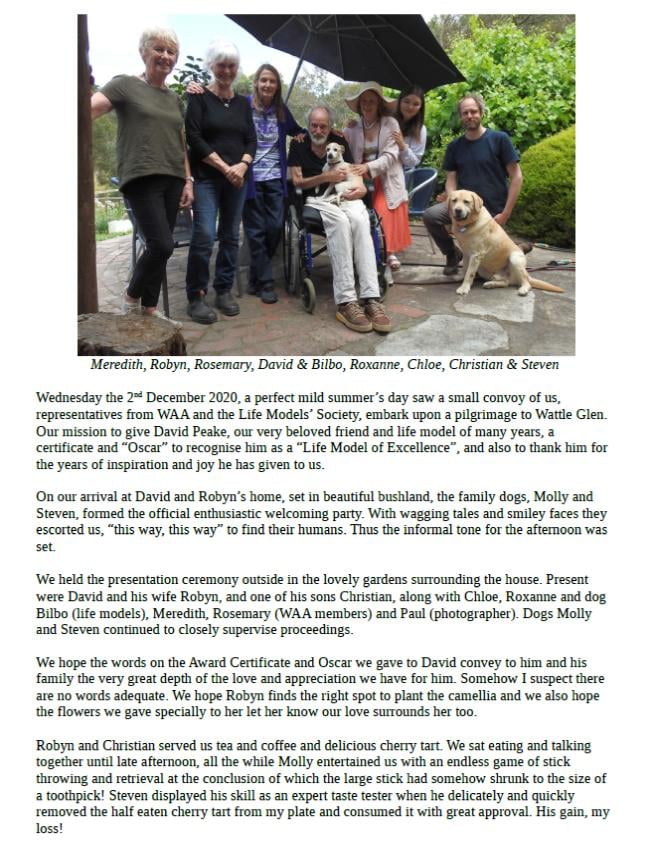 Below is the article and photos that were published in the January 2021 Whitehorse Arts Association Newsletter plus some of my drawings of David from the WAA Life Drawing workshops. Sadly, David has motor neurone disease and is rapidly declining. Our love and best wishes go to David and his family.
