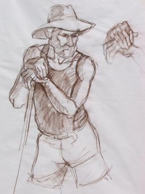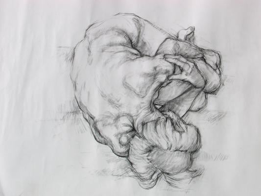 As our model, David’s unique signature poses are often (not always) an intricate tangle of bony arms and legs almost impossible for us to decipher. (David confesses he often includes extra arms and legs to confuse us!) With his most wonderful “Old Testament prophet’s face”, bony body and expressive hands and feet, these poses are the utmost challenge to our abilities and are always a joy and delight and inspiration to us. The one problem with these poses is David is not free to do a drawing of himself!